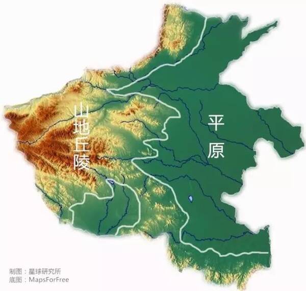 (河南地形图,山地丘陵与平原的分界线并不严格,山地丘陵区域也存在许多小块平原,谨供参考;星球研究所制作,底图源自@MapsForFree)
