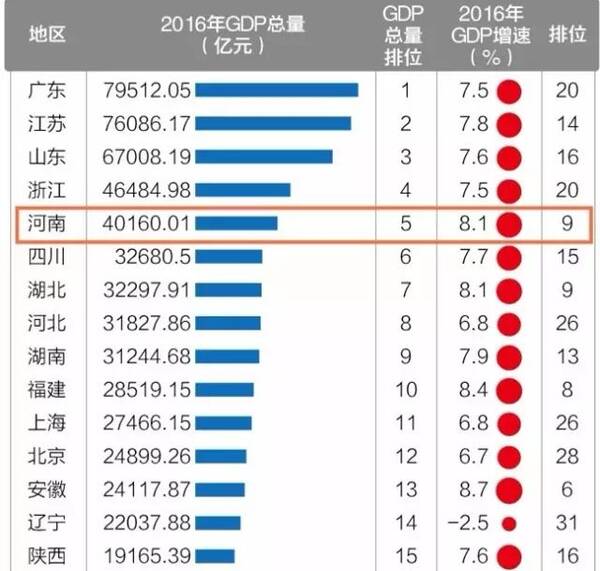 (河南在2016年各省区市GDP总量排名中位列第5,增速达到8.1%,虽然人均GDP有待提升,但整体成绩单可谓优异;图表源自@21世纪经济报道)