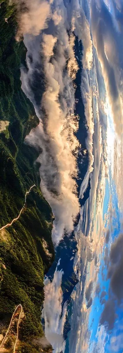 (位于辉县的天界山,红岩绝壁浮在云端、有如仙山,山体之上的缓坡让植物得以附着其上,形成两道绿色腰带;图片源自@天界山景区)