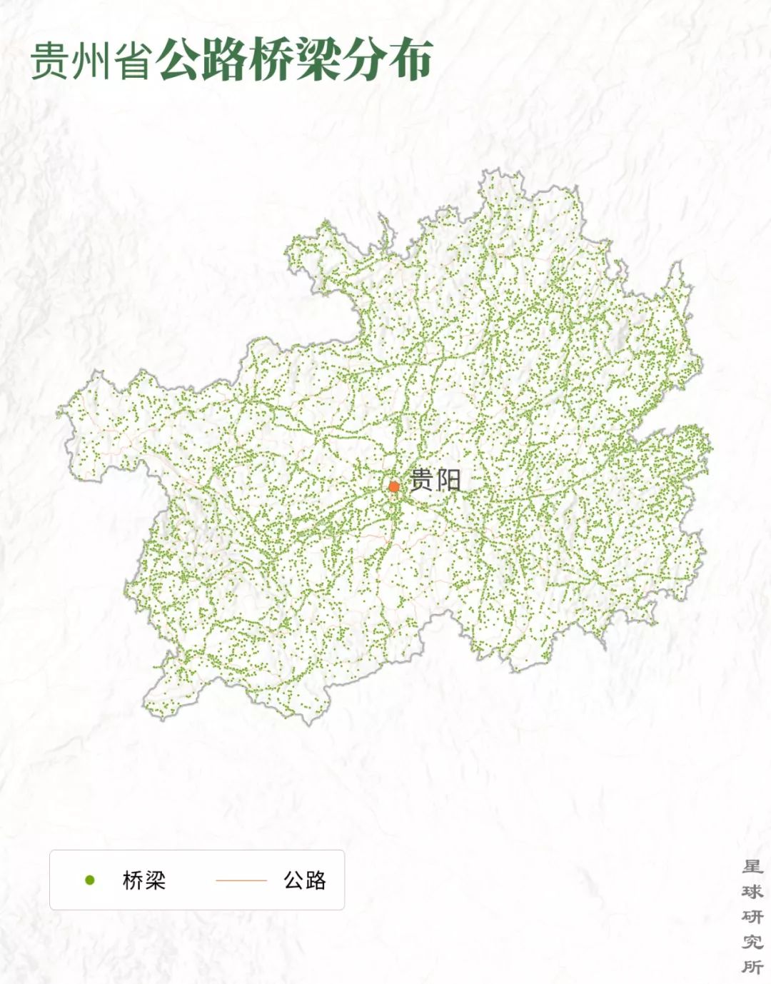 (密密麻麻的贵州省公路桥梁分布,每一个点代表一座公路桥,制图@巩向杰/星球研究所)