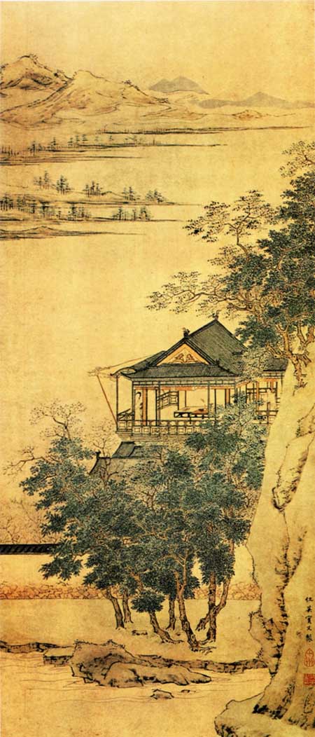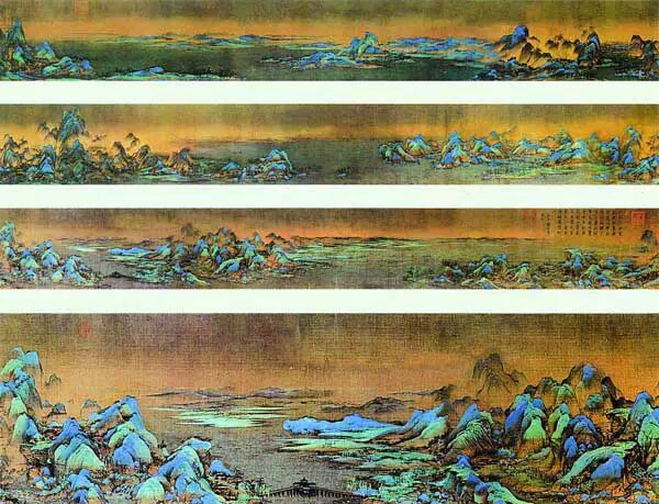 创造山水画金碧辉煌时代的是大小李将军。时任武卫大将军的李思训以《江山楼阁图》标一变之法,其笔墨达到了“夜闻水声”的通神境地。其子李昭道“变父之势,妙又过之”。二李的青绿山水可以说造百代影响,画史界有人称之为北宗之祖,历代均有追随,郭熙、范宽、刘松年、李唐、马远、夏珪、王晋卿、王希孟、赵伯驹、冷谦、仇英等都从中汲取着影响。