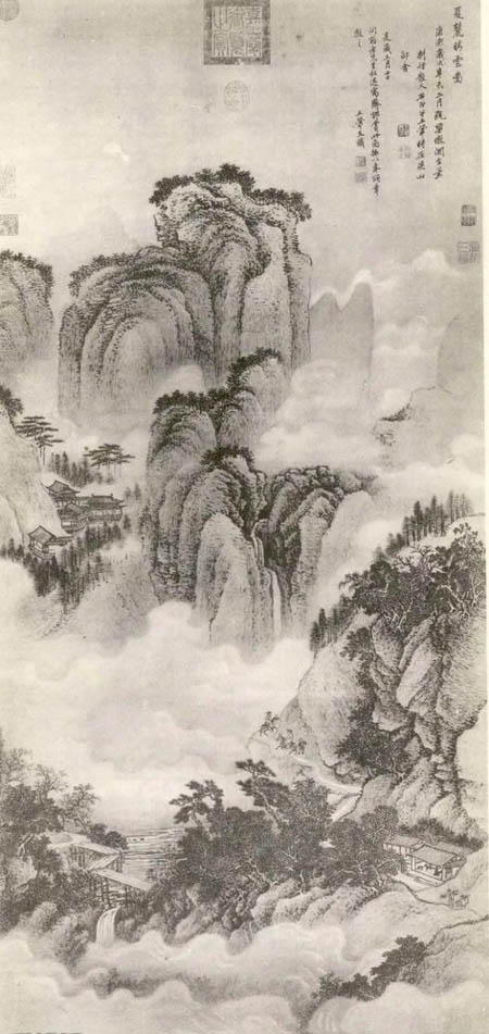 在这一过程中,起重作用的集成者是董其昌。他的南北二宗的山水思想,不仅统一了当时的认识,也为满清山水划设了定势。董氏集成主要是在美学立境上强调了以禅入画的禅宗喻诗说,“行万里路、读万卷书”的体验说,文人画“启人之高志、发人之浩气”的士气说,且以士气为美知,以南宗为气脉的复归思想。以董为代表的华亭派,客观上起到了笔墨一统的作用,以致达于“家家子久,人人大痴”的程度。当然董氏想力挽“浙”、“吴”两派颓废之风的志向,也有历史的局限,需一分为二。