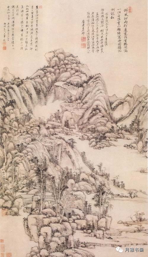 本来山水画发展到明中页,已较为开放,画派纷争是主要特色。这是一种有生命活力的表现。在四起的画派中,主要可分为以戴进为首的“浙派”和以明四家(沈周、文徵明、唐寅、仇英)为代表的“吴门派”。这些实践多以古人之能立自家心迹,笔墨未见突玻,立意反见小气。这恰是董氏发问的出发点。遗憾的是,已达于极致的山水笔墨,虽有董氏正统之心,却再无实践突玻之力,“华亭”终未跳出“吴门”窠白,中国山水画步入了一个集成后的守成期。