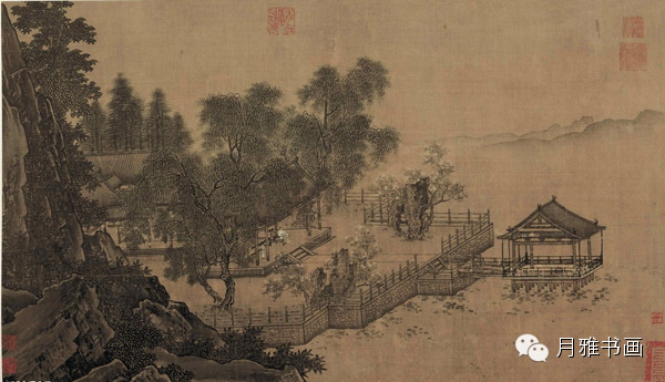 以“竹锁桥边卖酒家”为院试首选的李唐,成为南宋画院的领袖,他南渡以来,把青绿与水墨结合起来,取法荆、范而创大斧劈皴,其《清溪渔隐图》水墨齐下、线面结全、删繁就简,具有高度的概括性,自成刚劲犀利、雄阔磊落的一家风范。追慕李唐的刘松年,在《四景山水》中变斧辟皴为刮铁皴,集人物、楼宇、湖山为一体,表现了他对青绿、水墨画的多向认知,以及把李唐的画风趋于典雅、精美的取向。
