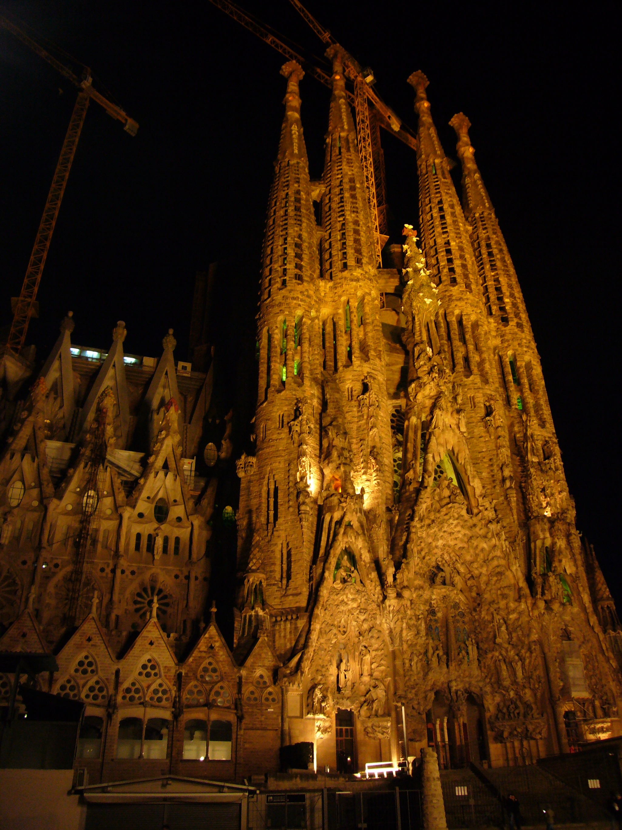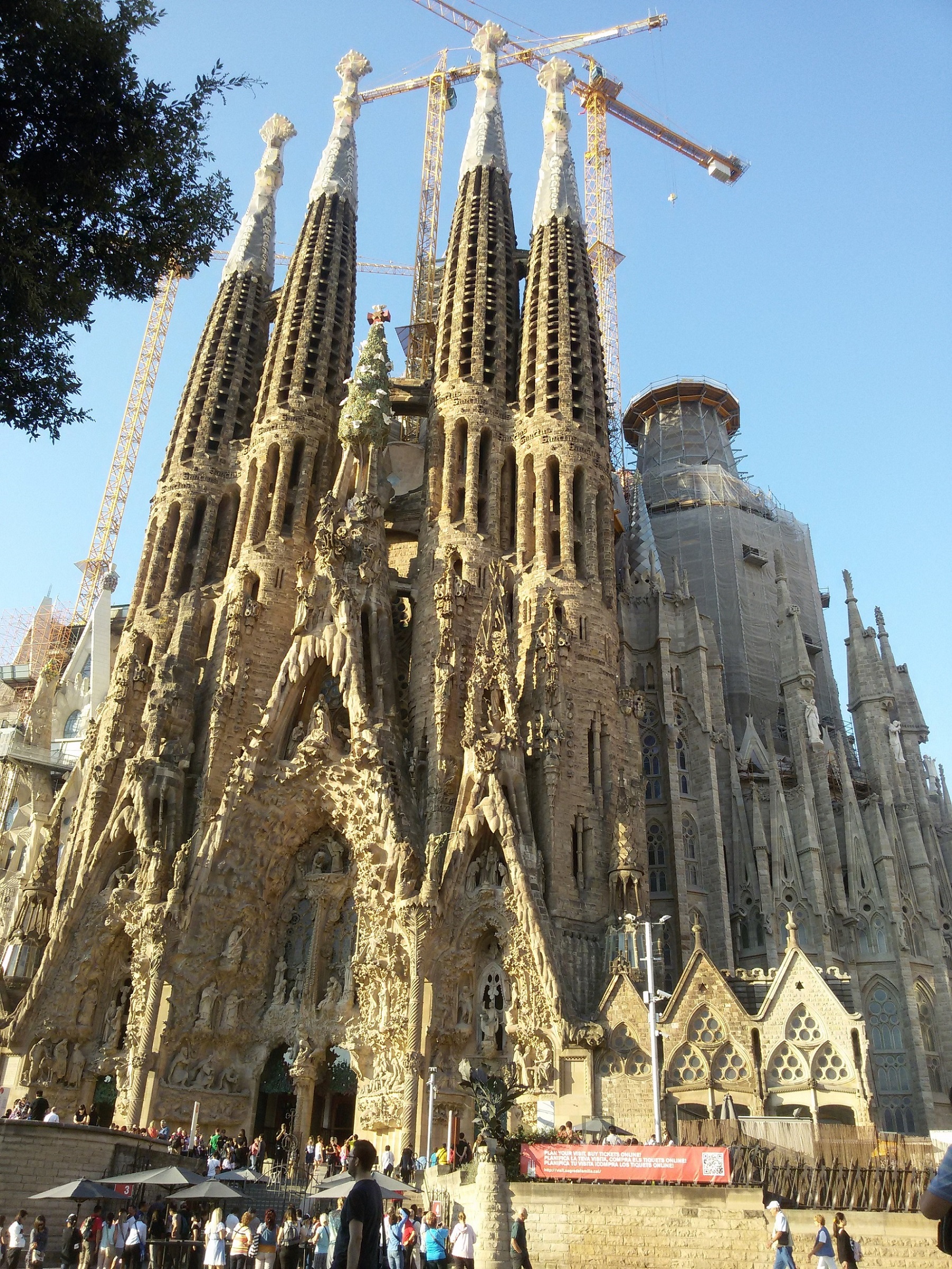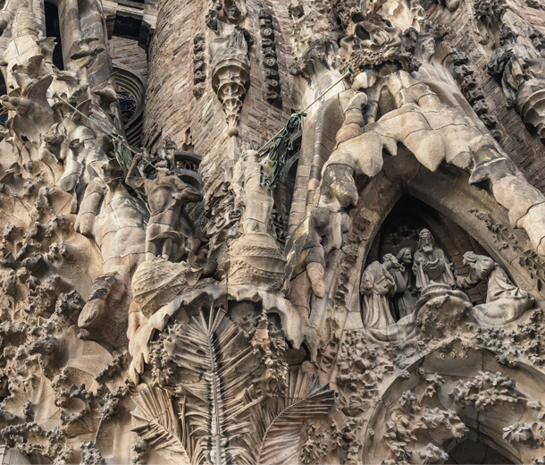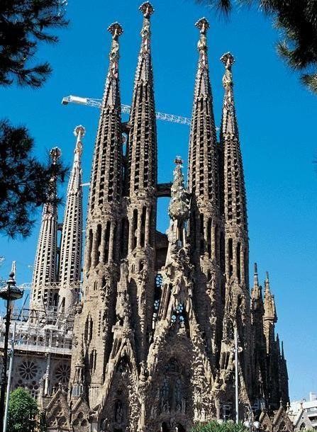 西班牙巴塞罗那圣家堂—全称神圣家族赎罪圣殿,因此主要靠个人捐款,始建于1882年,由安东尼·高迪接替原设计师,毕其一生致力设计直至车祸去世。捐款影响工程进度,所以至今仍在修建中。建筑风格属于新艺术运动,设计使用自然色彩,以动植物、山脉洞穴等为灵感,展现《圣经》场景,分为诞生立面,受难立面和在建的荣耀立面,还有十八座高塔。整个设计没有直线和平面,只有螺旋、锥形、双曲线、抛物线,高迪曾说:“直线属于人类,而曲线归于上帝。”